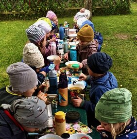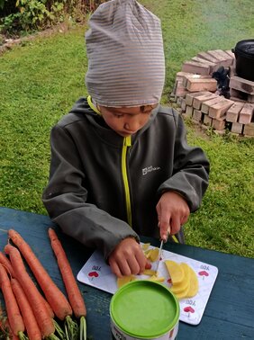 Der erste Frost ist nicht weit und so wurde die „Gärtle“-Saison mit einem großen gemeinsamen Erntedankfest und Abschiedsessen beendet. Ein letztes Mal für dieses Jahr kam unser „Opa Gerhard“, der sich als gelernter Gärtner und tatsächlicher Opa eines unserer Kinder seit Jahren mit riesigem Herz für die Wurzelkinder und Waldtrolle engagiert, zu uns und hat mit Hilfe der Riesen, also den Vorschulkindern, eine Suppe vorbereitet, die allen Kindern herrlich gut geschmeckt hat und voll und ganz aufgegessen wurde. Vielen Dank „Opa Gerhard“ für deine Liebe und Zeit, die Kinder nehmen aus den Begegnungen und Erfahrungen sehr viel mit!