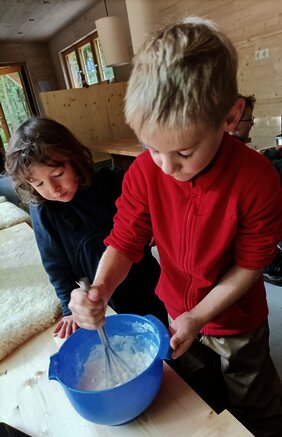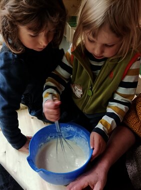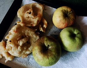 Aus ebenfalls selbst geernteten Äpfeln gab es kurz darauf ausgebackene „Apfel-Ring-Küchle“ - beim reinen Anblick steigt der herrliche Duft in die Nase. So wurde nun auch der neue Ofen im kürzlich eingeweihten neuen Waldwagen auf seine Koch-Funktion hin ausprobiert: Test bestanden!