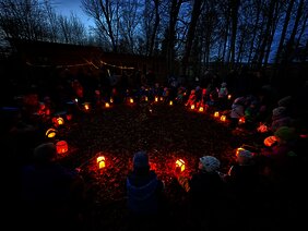 Mit viel Freude haben zahlreiche Kinder am 25.Oktober ganz unterschiedliche Gesichter in Rüben geschnitzt, die nun abends vor unseren Türen strahlen. Wir hatten eine wunderbare Zeit zusammen im Wald und wir danken Familie Wurm für die Möglichkeit Rüben abzunehmen, auch allen großzügigen Schnitzern und den Waldfamilien für ein herrliches Buffet zur Stärkung.